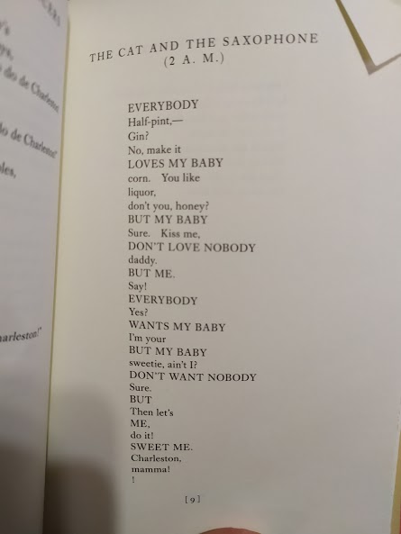 In this poem we can read a ragtime song in capital letters (EVERYBODY/LOVES MY BABY/BUT MY BABY/...) alternating with a small talk and a couple who dances Charleston.